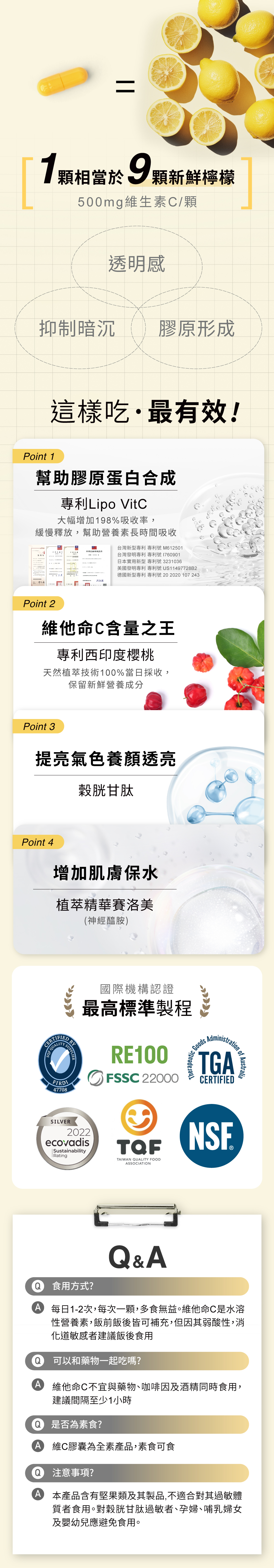 ●每顆500mg維他命C 等於9顆新鮮檸檬